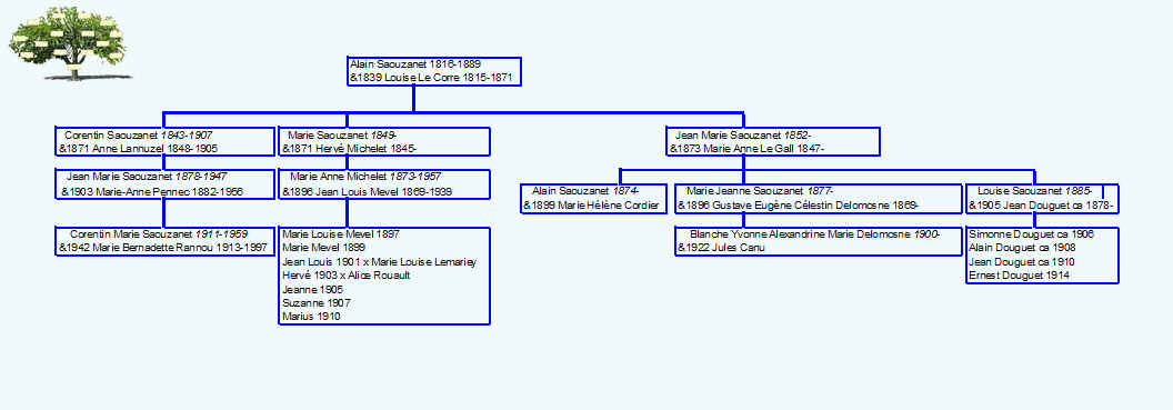 Jean Marie SAOUZANET, fils de Alain et Louise LE CORRE est né le 27/04/1852 à Gurvennou en Edern ; Il est le frère de Corentin (marié à Anne Lannuzel) qui est venu s’installer vers 1872 à Guergaridou. Corentin est le grand père de mon grand père.