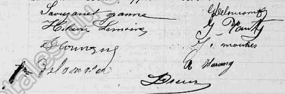 Le 11 juin 1896, 1er mariage de l’année à Ablon (!) Marie Jeanne SAOUZANET née à Briec (Finistère), fille de Jean Marie journalier et de Marie Anne Le Gall journalière, se marie avec Gustave Eugène Celestin DELOMOSNE, né à Fiquefleur Equainville, employé à l’usine de dynamite d’Ablon, fils d’Arsène Honoré DELOMOSNE chauffeur et de Adélaïde Alexandrine MARECHAL, concierge.