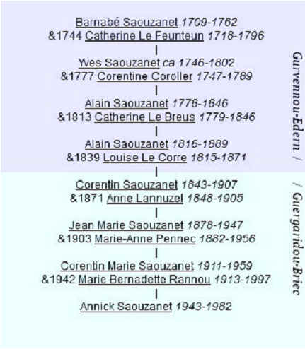 Corentin SAOUZANET (1843-1907) sera le dernier (du nom) à avoir exploité la ferme de Gurvennou… Lors de son mariage, Corentin était domicilié de fait à Briec et de droit à Edern (chez ses parents), il avait acquis la ferme de Guergaridou avant 1871, année de son union avec Anne LANNUZEL (1848-1905)… Trois siècles se sont écoulés depuis la naissance de Guillaume SAOUZANET, nous continuons à rechercher les descendants de Guillaume et de Marie SALAUNIC, mais nous découvrons de jour en jour des liens familiaux avec d’autres patronymes qui sont aussi parmi nos ascendants…