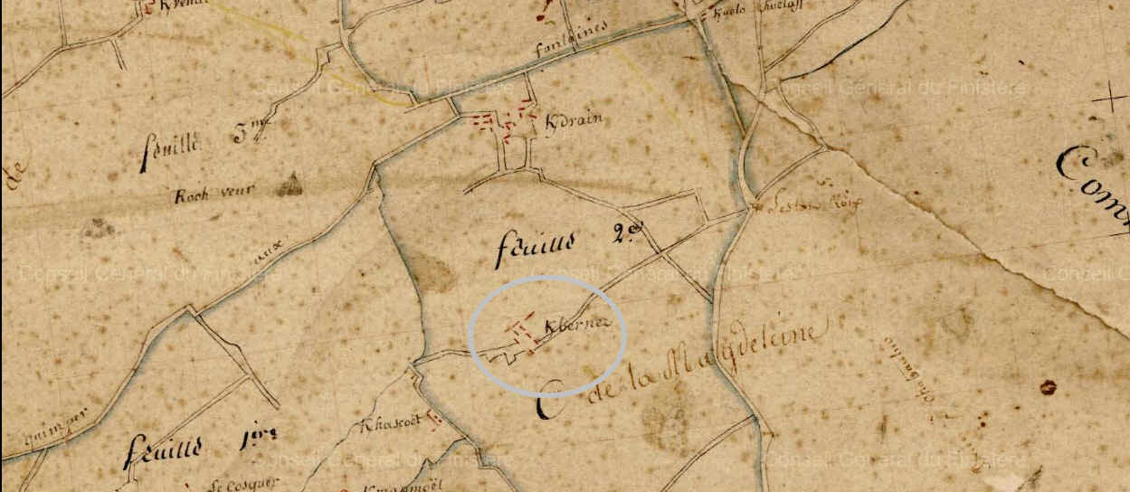 Caché derrière des grands fossés de bois, se trouve une parcelle de 3 kilomètres de diamètre située sur un plateau depuis lequel on a vue sur les monts d’Arrées. Cette parcelle se nomme « Goarem An Tuchen » ; « Goarem » signifiant terrain pierreux et « Tuchenn » est un mot de la basse Cornouaille signifiant butte.