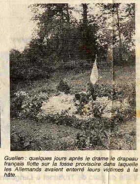 article OF du 24/06/1994 La veille, sous la direction du sergent-chef Lastennet, une quinzaine d'hommes marche en direction de Guellen, transportant des explosifs. Arrivés à destination, ils aident dans l'après midi les fermiers à la récolte du colza. Dans la soirée, les hommes quittent leur refuge, un penty prêté par les fermiers ; ils ont ordre de saboter les lignes téléphoniques de la route de Brest. Une fois leur mission accomplie, ils reviennent fourbus à Guellen sous une pluie battante. Le lendemain matin, ils sont réveillés par les allemands... la tragédie a lieu, et avant de partir les allemands mettent le feu à la ferme. Quant au reste de la troupe des FFI, elle s'enfuit en direction de Penhoat près du Stangala (Quimper) en passant par Ty Mab Fourman ; les blessés s'y feront soigner par des médecins clandestins. Penhoat est le PC des FFI de Quimper (Poste de commandement), et ce même jour, probablement suite à une dénonciation, les allemands débarquent et tirent sur 4 jeunes maquisards ainsi que sur le responsable du PC. Les allemands trouvent à Penhoat les fiches de renseignements concernant les différents secteurs de résistance et c'est le lendemain, le 28 juin qu'ils vont débarquer à Kergrenn (route de Bénodet) et tuer 6 autres résistants.