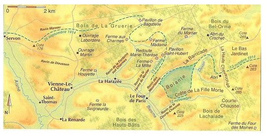 « A la fin du mois d’octobre 1914, le régiment se trouve en face de Vauquois. Ce village, perché sur une colline abrupte, domine toute la campagne environnante. La position command e la vallée de l’Aire, depuis Varennes jusqu’à Clermont. Du haut de cet observatoire merveilleux l’ennemi surveille toute la plaine de notre côté et a des vues jusqu’à la ligne de chemin de fer Sainte-Menehould-Verdun.